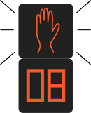 ![]() | The flashing orange hand, which may be accompanied by a countdown timer, indicates that pedestrians should cross only if they have enough time to reach the other side or the safety zone before the orange hand stops flashing. If pedestrians have already started to cross, they should hurry up. |