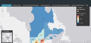 The interactive map of the 2024 road safety record lets you visualize statistics related to road accidents and driver’s licence holders, detailed by Québec region, regional county municipality (MRC) or municipality. The map is available in French only.