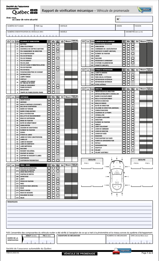 ![]() | Rapport de vérification mécanique « Véhicule de promenade » (PDF, 330.6 KB) 2 pages (7104 30) Ce formulaire sert d’aide-mémoire des composantes à vérifier sur les véhicules de promenade, les véhicules d’urgence et les véhicules taxis. |