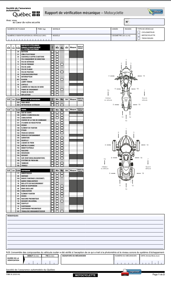 ![]() | Rapport de vérification mécanique « Motocyclette » (PDF, 630.9 KB) 2 pages (7105 30) Ce formulaire sert d'aide-mémoire des composantes à vérifier sur les cyclomoteurs et les motocyclettes. |
