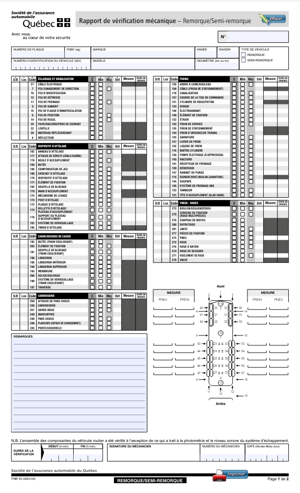 ![]() | Rapport de vérification mécanique « Remorque/Semi-remorque » (PDF, 311.6 KB) 2 pages (7107 30) Ce formulaire sert d’aide-mémoire des composantes à vérifier sur les remorques et les semi-remorques. |