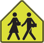- Indicates the beginning of a school zone. A speed limit sign accompanies this sign and indicates the speed limit in the school zone, as well as the times, days and months the speed limit is in effect.